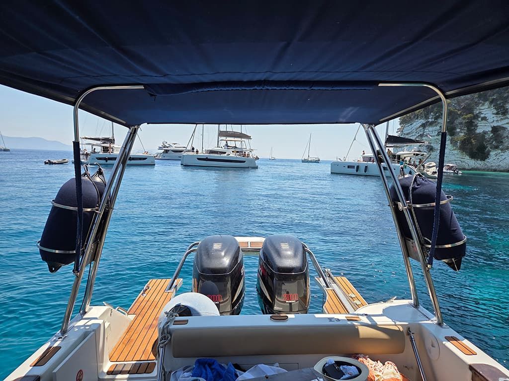 Διαθέτει δύο ισχυρούς εξωλέμβιους κινητήρες SUZUKI DF 200 V6 και πληροί όλες τις απαραίτητες προδιαγραφές ασφαλείας για μια ασφαλή και αξέχαστη περιήγηση στην Ιθάκη, όπου μπορείτε να επισκεφθείτε μοναδικά φυσικά αξιοθέατα και ιδιωτικές παραλίες προσβάσιμες μόνο με σκάφος.